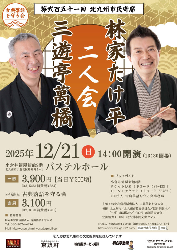 教職員のみなさん🍀お得な価格で👀購入できます!北九州市民寄席😄第251回「林家たけ平・三遊亭萬橘」12/21(日)